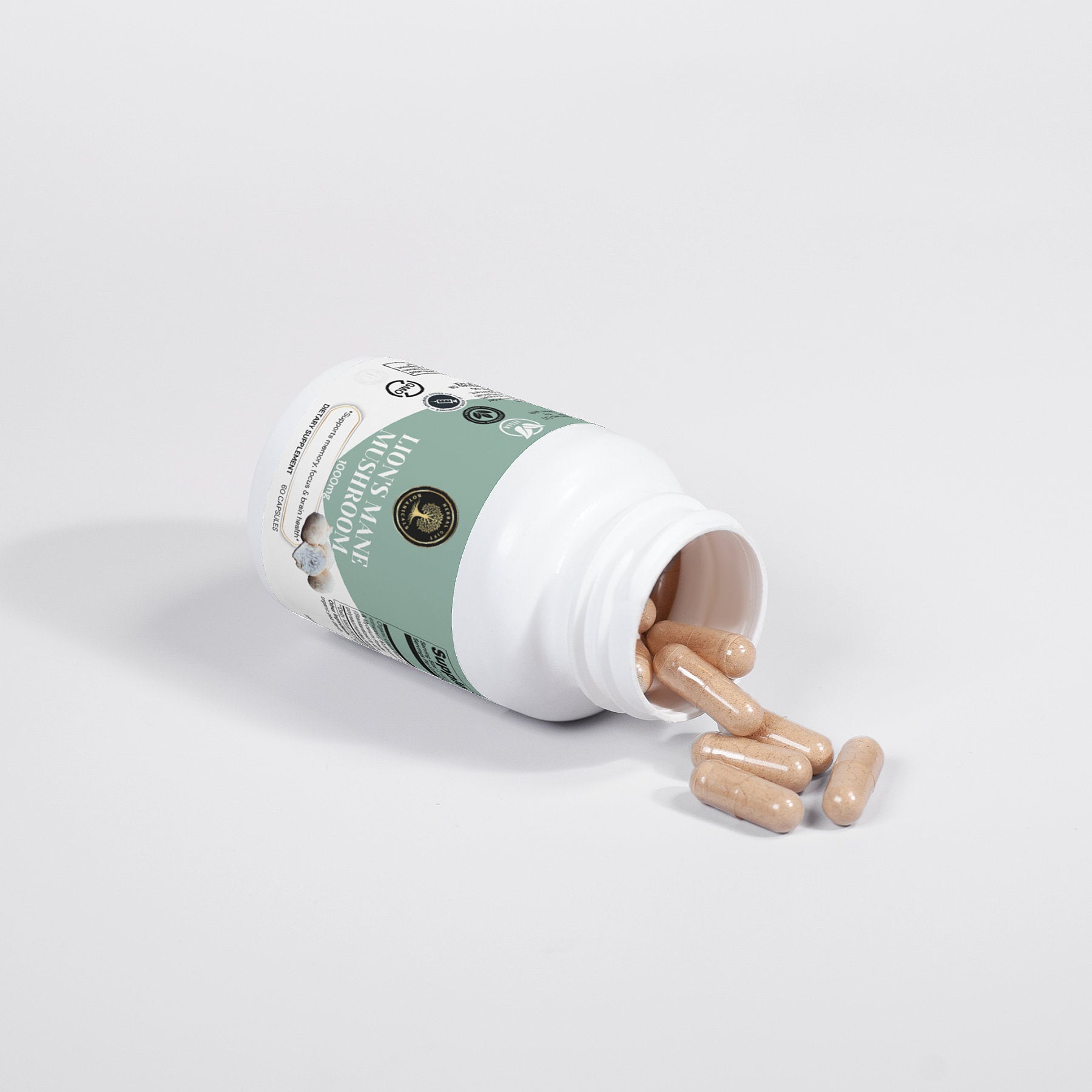 Ingredients: Organic Lion’s Mane (Hericum erinaceus) Mushroom Fruiting Body & Mycelium Powder (Standardized to 40% polysaccharides [400mg]), Organic capsule (pullulan, water), organic pea starch.